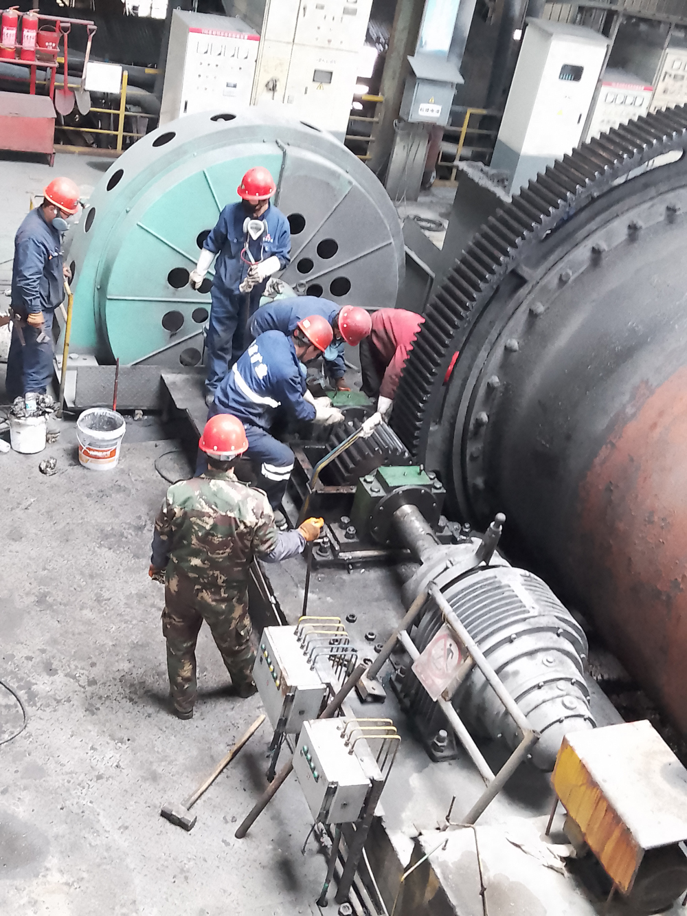 4月6日上午8時,按照計劃安排球磨機鋼球已經(jīng)全部倒出,白班進行舊襯板拆除工作。同時,磨選車間充分利用本次檢修機會,同步工藝停機,對10#球磨機鼓式給料器進行更換、對11#球磨機出料端端蓋進行檢查補焊、對8#球磨機小齒輪軸承座北側(cè)螺栓進行更換。